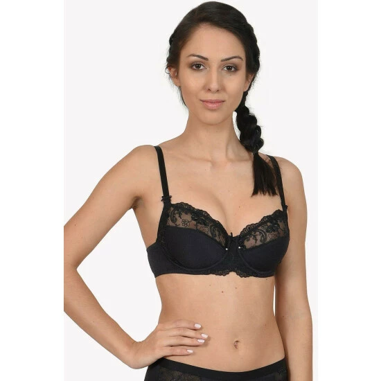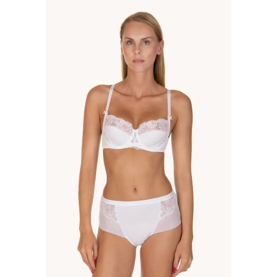 This elegant full cup ‘Caroline’ bra from Lisca is perfect for those who love unpadded bras and do not want to sacrifice comfort to look seductive. The bra is made of soft and slightly shimmering jacquard knit that feels just like a second skin. For a more comfortable fit, the bottom of the cups are lined with elastic tulle which gentle hugs your body and offers. The bra has partially transparent rich embroidery of gentle flowers, which elegantly reveals some more skin. The straps are decorated by bows, and another decorative bow with gentle beads is placed between the cups. For elegant seduction, combine the bra with panty briefs, brazilian briefs, or high-waist briefs from the same range.