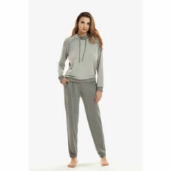 This stylish pyjama set from the ‘Kelly’ range includes a long sleeve hoody and matching trousers. The hoody features a hood, drawcord and elasticated cuffs. The bottoms feature two side pockets, a drawcord and elasticated cuffs. This set is soft and comfortable for a great night’s sleep.