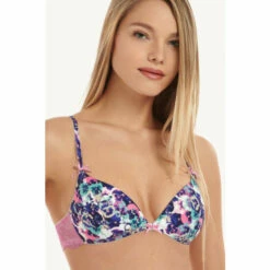 This non-wired bra from the ‘Kimberly’ range is essential. The bra is designed in a seasonal bright floral print with lace detailing. Features padded foam cups, decorative bows and hook fastening. Fastening band and straps are adjustable to fit your preferences.