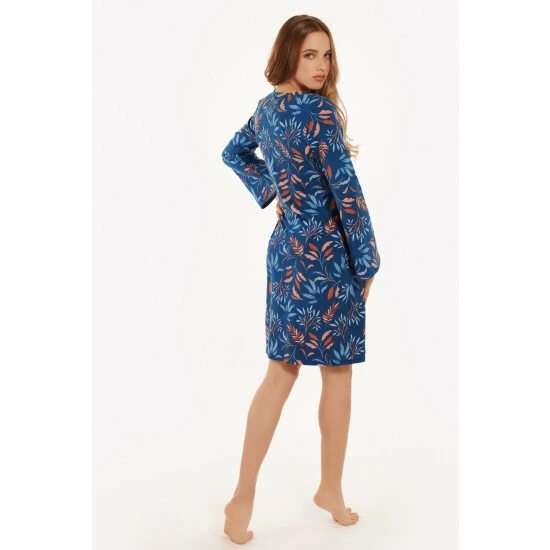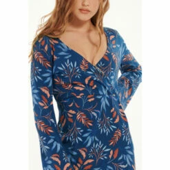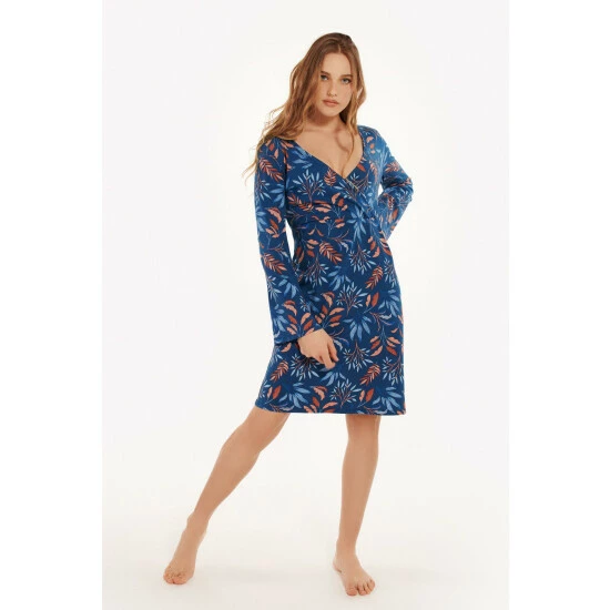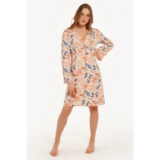 This cotton nightdress from the Lisca ‘Mellow’ range features a lovely leaf print, a modern wrap v-neckline, long bell-shaped sleeves, and falls to the knee. The wrap neckline means this style could be adjusted for breastfeeding.