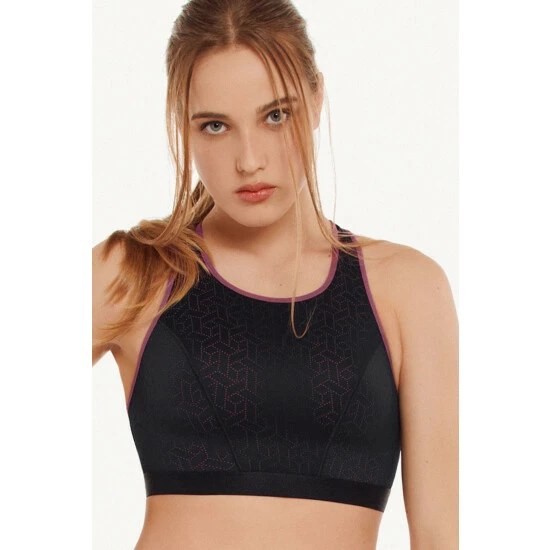 This non-wired sports top from the Lisca ‘Playful’ range is suitable for lighter exercise. This active sports bra features wide elastic under the breasts for a better fit, quick drying, microfibre material to wick away moisture and allow the skin to breathe, and modern geometric pattern lace.