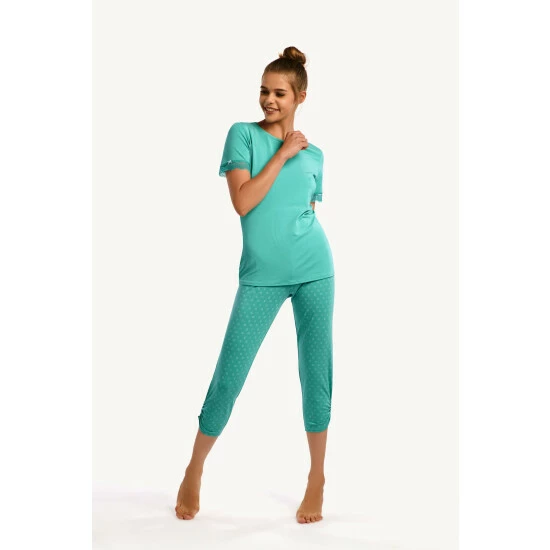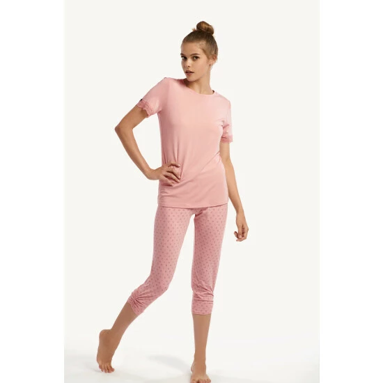 This pyjama set from the Lisca ‘Endless’ range includes a short sleeve top with lace and a bow and matching ¾ bottoms with decorative print and fold detail on the bottom. Features wider elastic on the waist, made from cotton blend fabric to ensure a good night’s sleep.